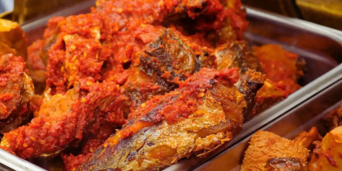 Palm oil pepper sauce with assorted meat and egg served on a bed of white rice