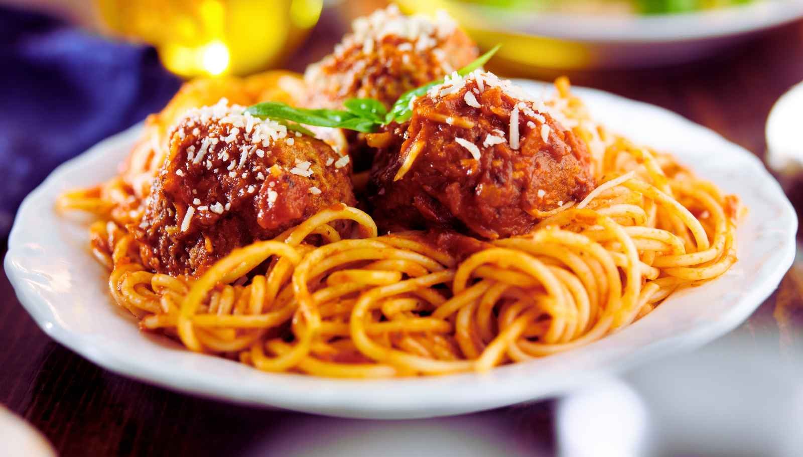 Spaghetti with a baseof flavourful tomato sauce, herbs and meatballs
